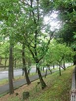 体育館裏の法面にあるヒメヤシャブシに若い緑色の果穂(種子が集まって房になっている)