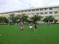 7月の日照不足で土が見えていた校庭も8月の猛暑で夏芝がよく生育し