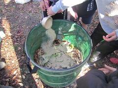 押し込んだ落葉の上に、落葉の分解を促す米ぬかと野菜くずを入れて、水を大量にかけます。