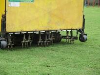 初めの工程は、芝に5cm程度の穴をたくさんあけて、根に空気を送り込むエアレーションです。
