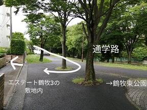 鶴牧西公園脇のクランクは見通しが悪く、児童以外の歩行者、自転車との接触の恐れがある。