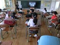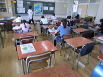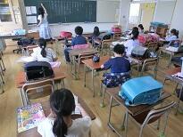 それぞれの学級を2つに分けて、2か所に分かれて休校中の課題の確認などを行いました。