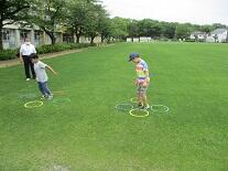 課題の確認が終わった後、校庭の芝生の上で柔軟体操をしました。
