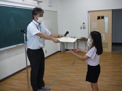 まずは、合唱団です。すでにご存じの方ばかりかと思いますが、合唱団は今年度のNHK全国学校音楽コンクールに出場しました8月1日の東京大会予選にて金賞を獲得し、8月10日の東京大会本選に出場し優良賞をいただきました。その合唱団を代表して6年生の2人が表彰を受け、大会出場の感想を語りました。