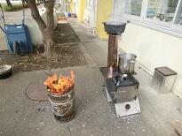 朝早くから、学校用務職員が薪をくべて火をつけ、鍋でもち米を蒸しました。
