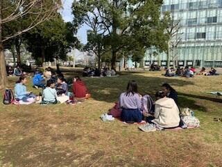 予定を変更して日本科学未来館前の公園で昼食をとっています。