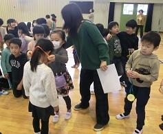 司会はすべて1年生が行います。ゲームの前に準備しておいたメダルをかけてあげました。