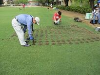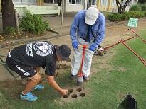元気な芝を切り出します   穴をあけて切り出した芝を入れます