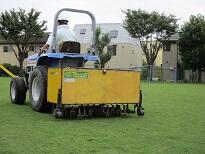 初めの工程は、芝に5cm程度の穴をたくさんあけて、根に空気を送り込むエアレーションです。