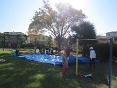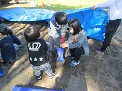 子どもたちがシートのおもしに砂を詰めてくれました。