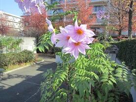 南鶴牧小学童クラブの前の遊歩道「そよかぜの道」にキバナコスモスが咲いています。