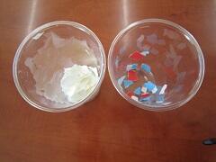 左が牛乳パックで右は折り紙です。折り紙を切ったものを混ぜて飾りにします。