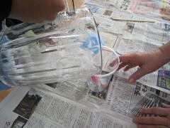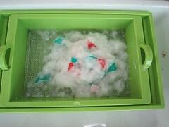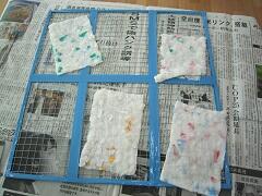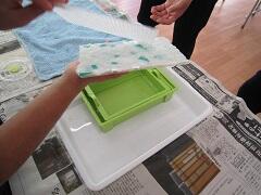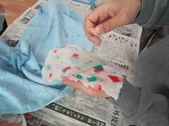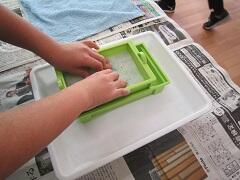 パルプに折り紙をちぎったものを混ぜて型に入れます。