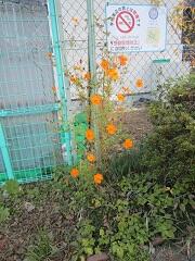 南鶴牧小学童クラブの前の遊歩道「そよかぜの道」にキバナコスモスが咲いています。