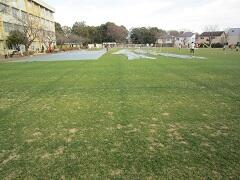 本校の全面芝生校庭は、多摩市教育委員会が芝生校庭管理の専門の方に委託して