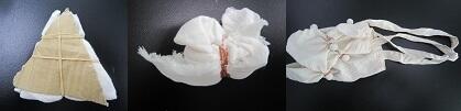 三角に折りたたんだり、渦状にたたんだりして輪ゴムで止めました。
