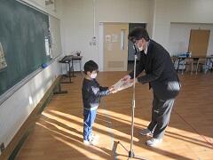 芝生管理作業ボランティアに5回参加した1年生と3年生2人を表彰しました。