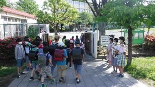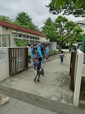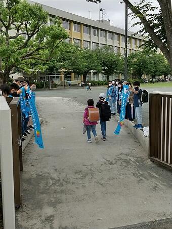 今までとの違いは、校舎内ではなく西門の前で登校してくる子供たちへ元気に挨拶をしてもらっています。