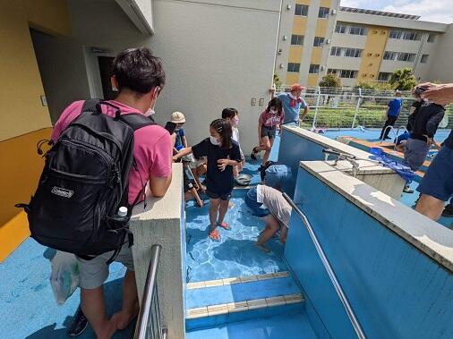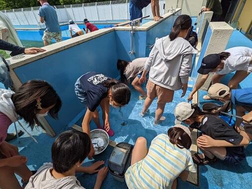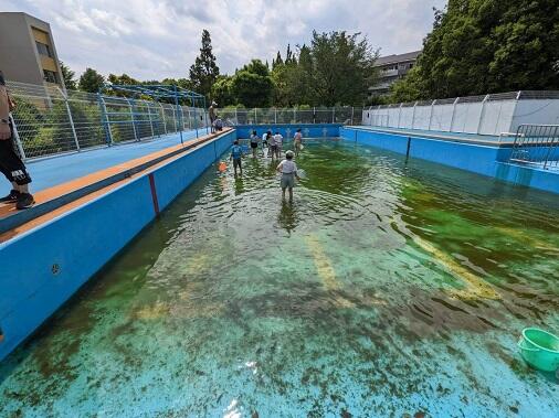 メダカすくいは、水位を下げたプールに入って網や手を使って行います。