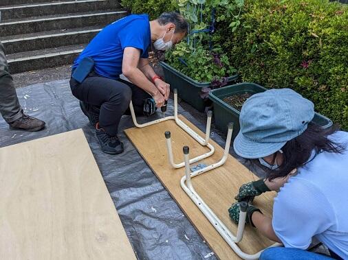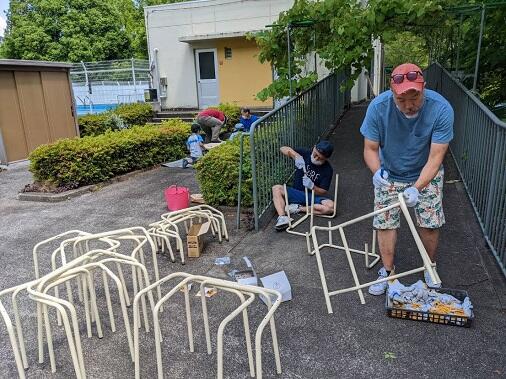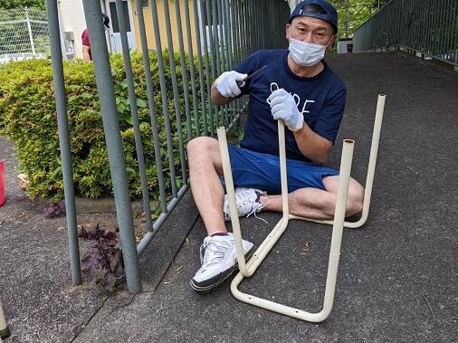 使わなくなった机や椅子の天板を剥がし、フレームのパイプを加工します。