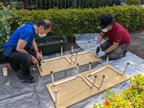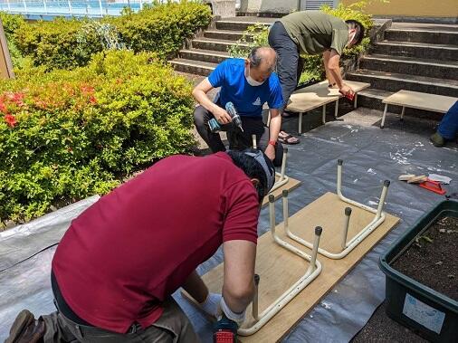 おやじの会の皆さんと本校職員の共同作業で、合唱団のひな壇を作りました。