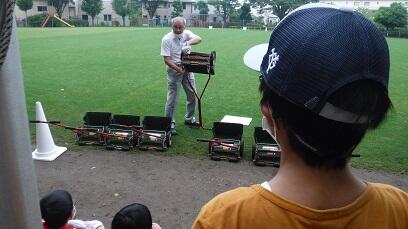 来週は冬芝の根を重機で切り、夏芝の成長を促進する作業(バーチカルカット)が行われます。
