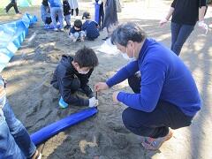 子どもたちがシートのおもしに砂を詰めてくれました。