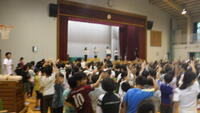 司会の合図で集会が始まり、本校の愛唱歌「みどりのふるさと」を歌いました。
