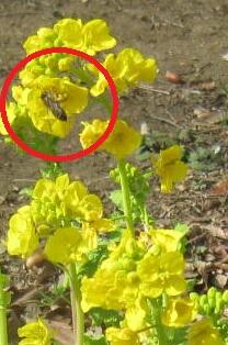 学校用務職員がミツバチのために巣箱の横に植えたアブラナ(菜の花)にも来ていました。