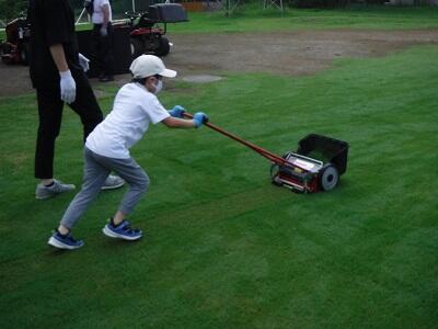 今日は夏休み最後の土曜日です。芝生の管理作業に多くの子どもたちと保護者の方々が参加してくれました。昨日の雨と夜露のためか、校庭の芝生が白く光っていました。水分を多く含んだ芝はとても重そうです。