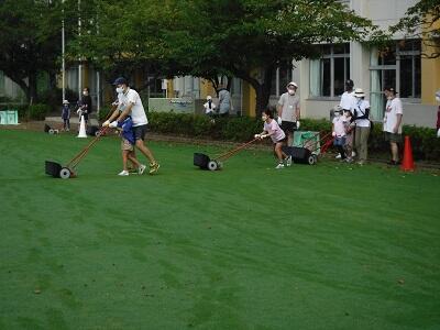 今日は夏休み最後の土曜日です。芝生の管理作業に多くの子どもたちと保護者の方々が参加してくれました。昨日の雨と夜露のためか、校庭の芝生が白く光っていました。水分を多く含んだ芝はとても重そうです。