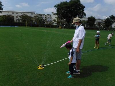 開始前に参加している子どもたちに「夏休みの宿題は終わってますか?「月曜日の準備はできていますか?」と尋ねると元気よく「はい!!」との返事。心置きなく水遊びの開始です。