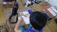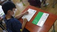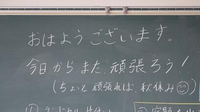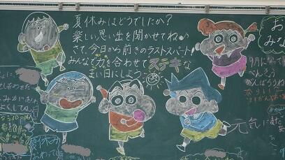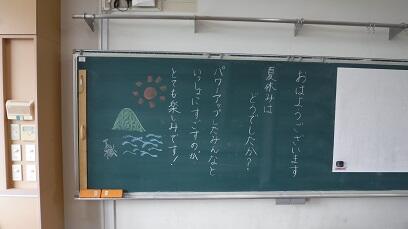 教室内では、本日配られた新しい教科書(下巻)に名前を書いているところでした。また、夏休みの思い出を発表している学級もありました。