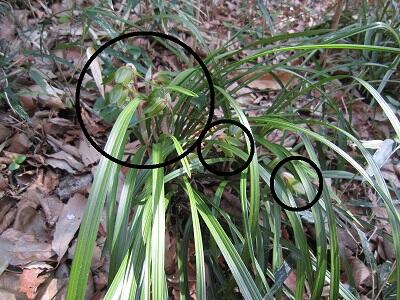 左写真の黒丸の中が花です。他にもたくさんの株があります。