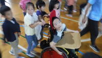 質問によるやり取りをしたり、車椅子を通して触れ合いを行ったりと、互いの距離を縮め合うための時間から始まり、風船等を使った体を使った交流も行いました。