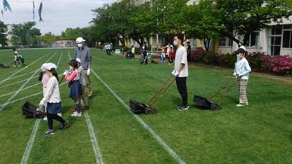 芝の伸びが早いため、芝刈り機がとても重く感じられます。低学年の子供たちは複数で押してもらいました。