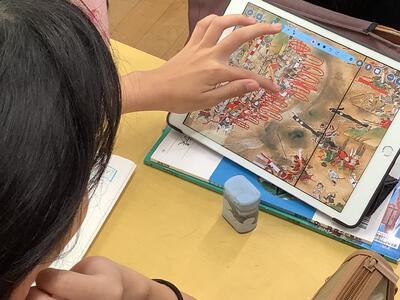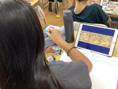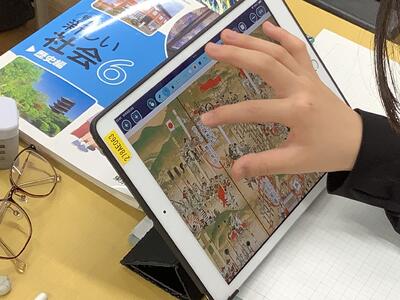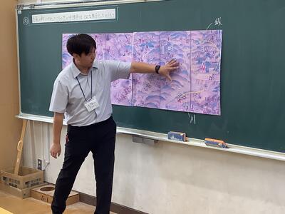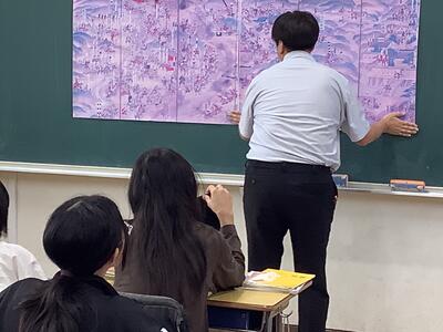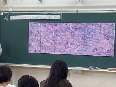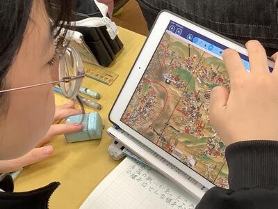 戦国時代の合戦の様子を音声資料や屏風絵などで児童へ提示します。