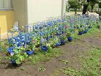 1年生が育てているアサガオの花がたくさん咲いています。