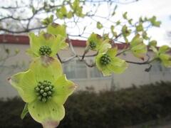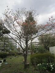 職員玄関前の赤いハナミズキや校庭南側のそよかぜの道の白いハナミズキも