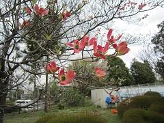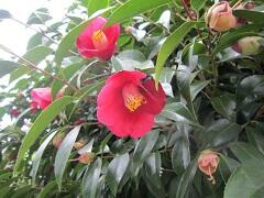 赤い花は木へんに春と書くツバキ。なんつる農園にあります。
