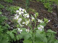 ダイコンの花は菜の花と同じ花のつくりです。ナズナと同じ純白ですが、