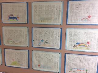 1年生の教室 廊下の壁に「いちねんせいのうた」という詩を書いた作品が掲示されています。一人一人の作品を見てみると、「一生懸命書いたんだなぁ。」ということが伝わっています。真剣に書くみんなの姿が目に浮かぶようでした。