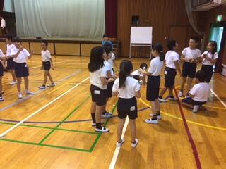 3時間目と4時間目は、中学年が表現の練習に取り組みました。中学年も、いろいろな並び方へと移動します。ひとつひとつ確認しました。リーダーを中心に、子供たち同士で関わり合いながら進めてきたからでしょう。困っている人、動きを忘れてしまった人に、声をかけたり、教えたりする人の姿を見ることができました。とってもうれしい姿です。