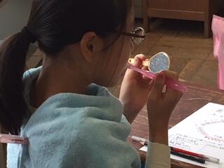 まず虫歯ができる理由や、歯磨きの大切さをお話しいただきました。その後、歯垢に反応するピンクの試薬を歯に塗り、どこに歯垢が付きやすいか、どこがしっかりと磨けていないかを、手鏡を使いながら、ワークシートに書き込んでいきました。