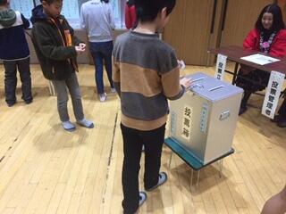 「給食大臣を選挙で選ぼう」という想定で体験は進んでいきました。実際に候補者の方々の主張を聞いたり、「いいな」と思った候補者の応援演説をしたりしました。そして実際に投票をして、自分の判断・意思を一票に託しました。その後、開封作業や当選証明書の授与等、実際の選挙の流れを体験しました。使われた投票用紙発券機や用紙を書くボックス、投票箱等は、選挙で実際に使うものを使わせていただきました。投票用紙も、破損がしにくい加工がされている本物の用紙を使わせていただくなど、本当に貴重な体験となりました。
