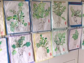 2年生の教室前の廊下の壁には、たくさんの「大根」が並んでいます!2年生たちが描いた大根の絵です。大根の身の部分、葉の部分、それぞれに味わいのある大根の絵が、まるで大根畑のように展示されています。