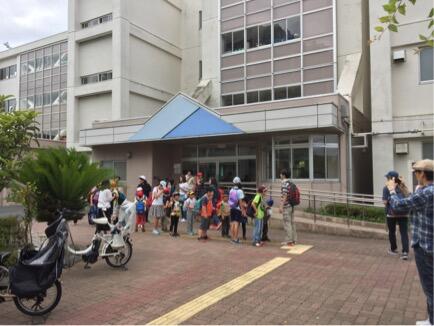 1年生は、今日、交通安全教室です。バスに乗って多摩川沿いにあるセンターに向かいます。