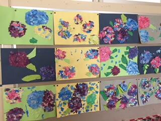2年生の教室前の廊下の壁に、素敵な紫陽花が並んでいます。2年生が作った紫陽花。ちぎった紙を貼り、思い思いの紫陽花を作りました。とっても素敵です。