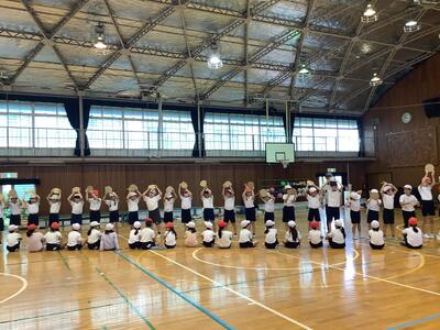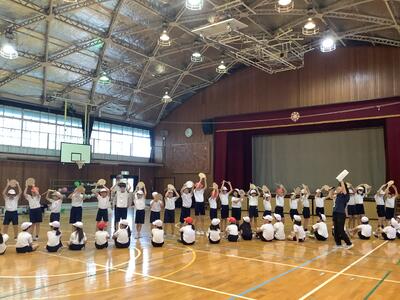 今日は、ウェーブの練習をしました。事前に練習した4年生が、3年生に見本を見せてくれました。それを見て、3年生も動きを覚えることができました。