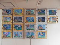 図工の作品が、ふわほかルームの前に飾ってあります。先日から6年生の作品が飾られています。体育着に着替えに来る子供たちなどが見て、「すごいなぁ」「きれいだなぁ」と話しています。宮沢賢治の「よだかの星」を想像して作成したものです。